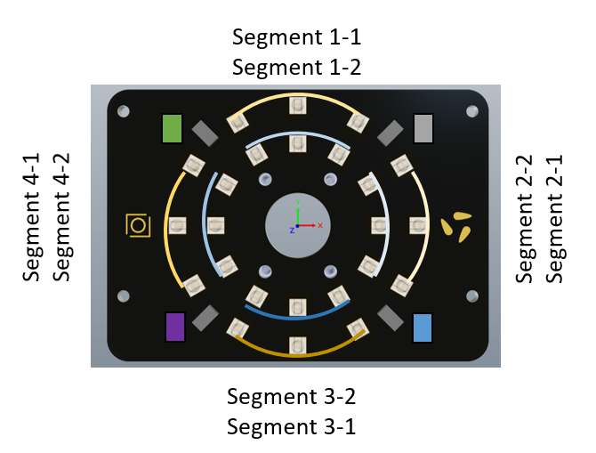 ![]() Loxi 1 controls one LED per segment, which is arranged in a ring around the lens. | ![]() Loxi 3 has two more LEDs per segment than Loxi 2, but the segment layout remains identical. |