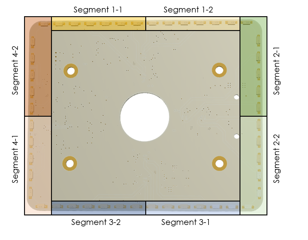 ![]() Loxi 1 controls one LED per segment, which is arranged in a ring around the lens. | ![]() Loxi 3 has two more LEDs per segment than Loxi 2, but the segment layout remains identical. |